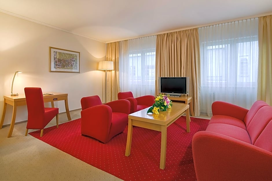 Suite has a flat-screen TV, seating area, and a large bathroom with a bathtub.